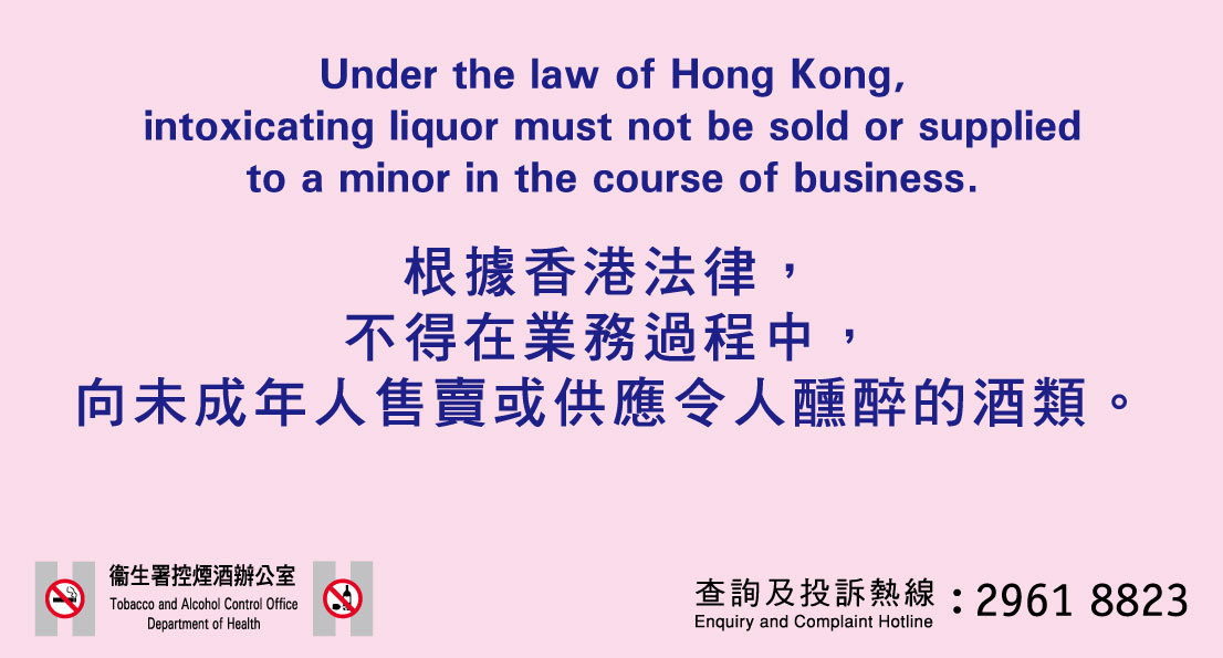 根據香港法律,不得在業務過程中,向未成年人(18歲以下人士)售賣或供應令人醺醉的酒類。
